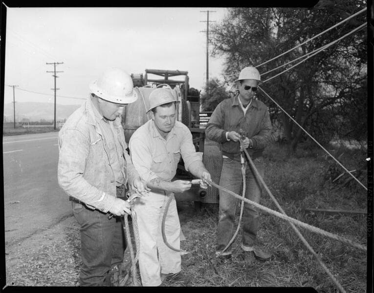 [Linemen stringing conductors on transmission poles.] [with 29 variants]