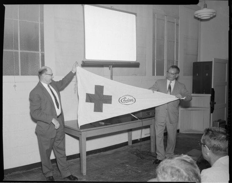 Broken suspension insulators. ; Group with safety award flag. ; Town Hall Award presented to Harold Quinton for Civic Achievement on display
