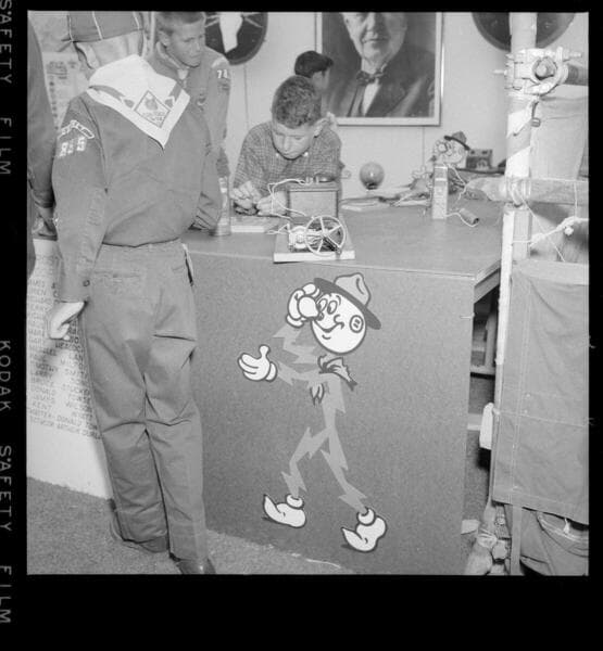 [Boy Scout Jamboree (Centinela Valley District BSA) in a large sports arena, with exhibits on Thomas Edison.] [with 10 variants]