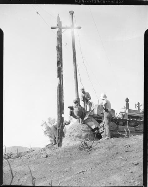 Edison crews repairing storm damage near Lake Arrowhead, March 20, 1983.