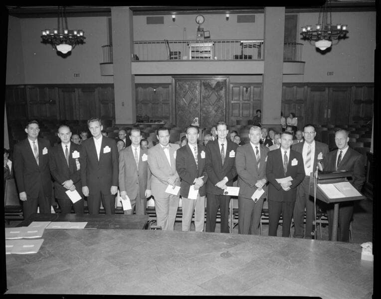 [Group shot of Edison men in suits on stage at GO auditorium. ]