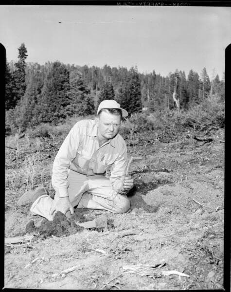 Big Creek Tree Farm - Bill Wingo measuring growth of pine seedling.