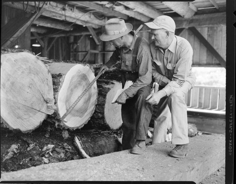Big Creek Tree Farm - Gerald Chaffee & Bill Wingo in a sawmill measuring the diameter of mature pine logs to determine the number of board feet and how much Edison gets paid.