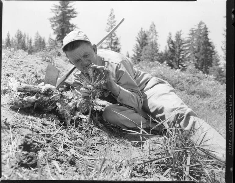 Big Creek Tree Farm - Bill Wingo holding a bare root pine seedling ready to plant.