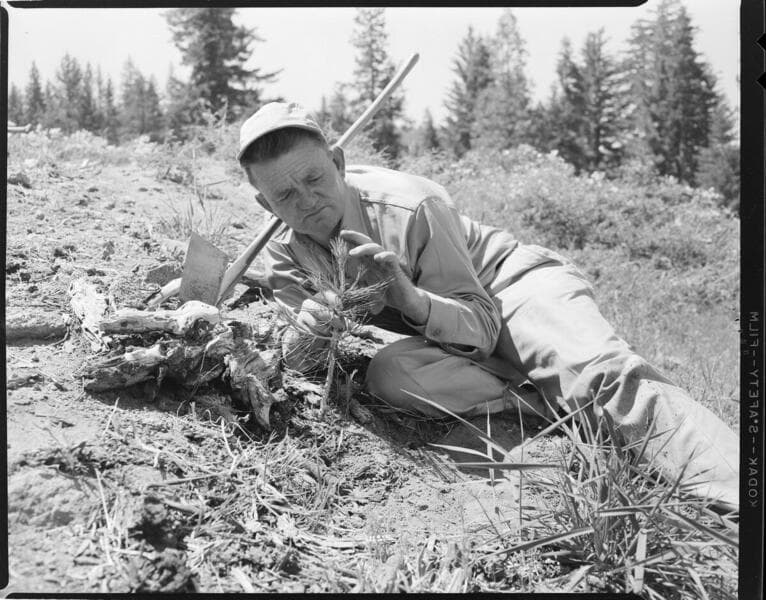 Big Creek Tree Farm - Bill Wingo holding a bare root pine seedling ready to plant.