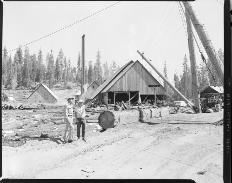 Big Creek Tree Farm - Paul Brock and Bill Wingo talking at logging site. Brock is a timber-cutter on contract to SCE and he sells to American Box Co. in Fresno.