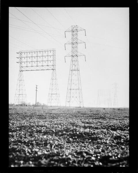 Transmission Lines, including Brea Camp on the Lighthipe-Chino 66kV transmission line, mess hall, kitchen, hospital tent; Long Beach-Lighthipe-Laguna Bell transmission line, including multi-circuit tower construction, driving piles for tower foundations, collapsed Long Beach transmission line tower; Vincent 220kV transmission line, including road building, Construction Camps 2, 3, 6, 8, 9, and 10, Camp 6 kitchen and mess hall, Maple Canyon, Big Tujunga, transporting tower materials, tractors pulling graders, pack trains, building towers, pulling cable, cable splicing.