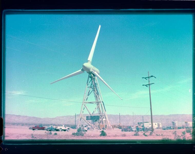 The original 500-kilowatt Darrieus vertical-axis wind turbine dominates this 1981 view of the Wind Energy Center
