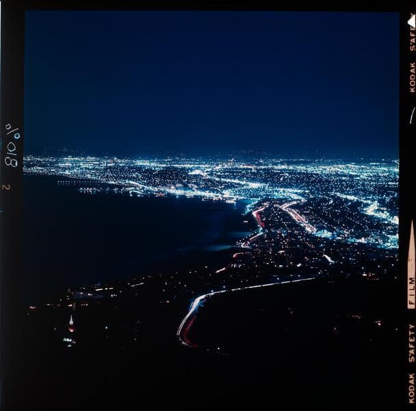Cityscape at night showing streetlights of West Los Angeles. Looking north to Santa Monica from Palos Verdes Peninsula