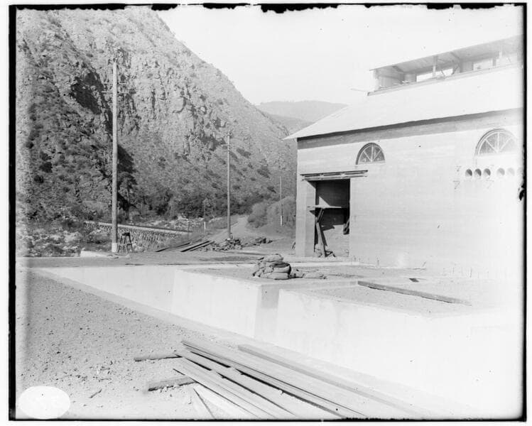 The exterior of Mill Creek #2 Hydro Plant prior to the construction of Mill Creek #3 Hydro Plant, ca. 1899.