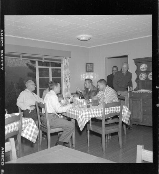 Group of men on a Big Creek Hydroelectric tour - showing the airline flight, the Big Creek guest house, dinners, poker night, Powerhouse #1, Mammoth Pool Powerhouse, fish hatchery, etc. [with 111 variants]