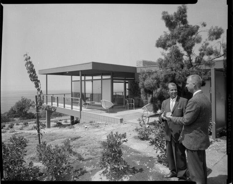 [Men inspecting Medallion Home display plates. ] [with 11 variants]