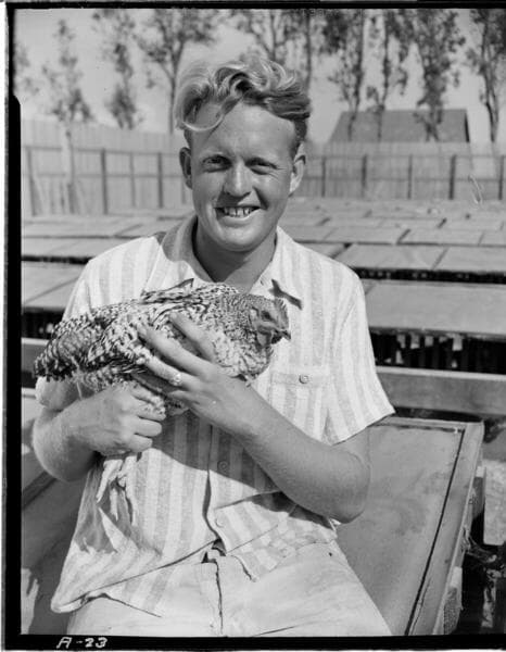 Prickett Poultry Ranch - Al Prickett with hen - Santa Ana