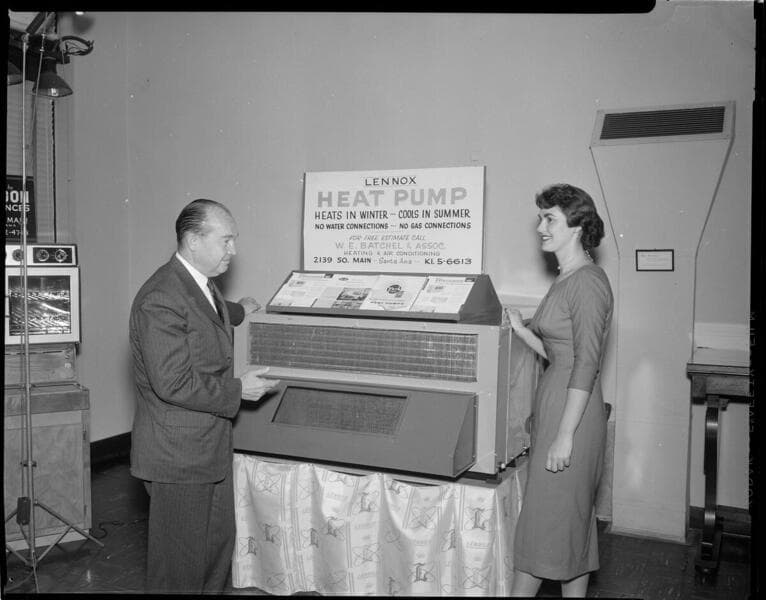 Edison exhibit [at Fairplex] showing electric living and Heat Pumps [with 14 variants] - some shots feature model at Heat Pump display and three of them are composite copynegs showing the model in two places.