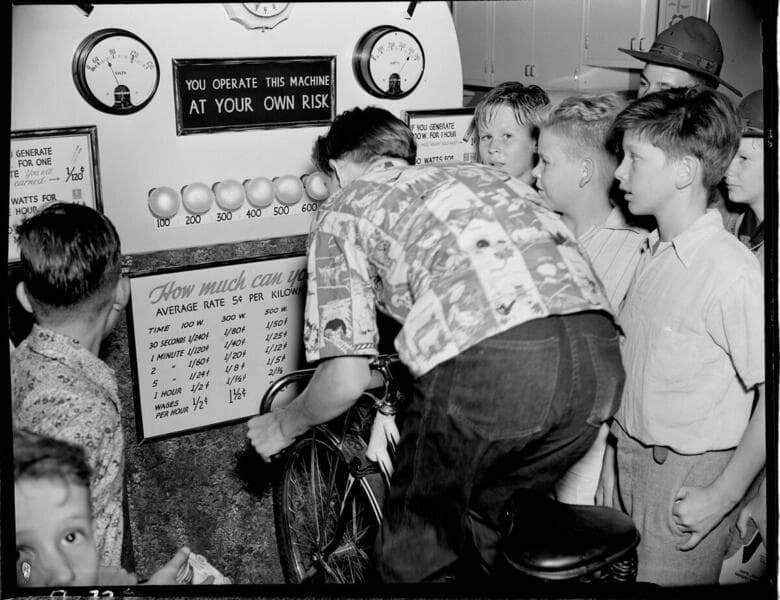 Pomona Fair - Bicycle generator exhibit. [shows the amount of money earned by pedaling a bicycle powered generator].