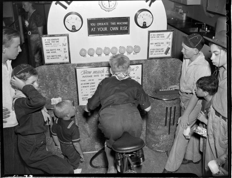 Pomona Fair - Bicycle generator exhibit. [shows the amount of money earned by pedaling a bicycle powered generator].