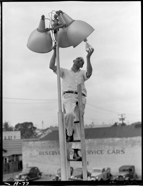 Mr. Patterson on ladder fixing San Gabriel floodlight