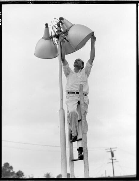 Mr. Patterson on ladder fixing San Gabriel floodlight.