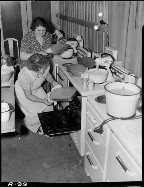 Big Cake - Venice Ballroom - Mrs. Ethyl Rodgers taking cake out of oven.
