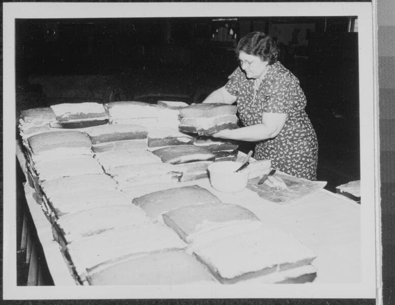 Big Cake - Venice Ballroom - Mrs. Ethyl Rodgers taking cake out of oven.
