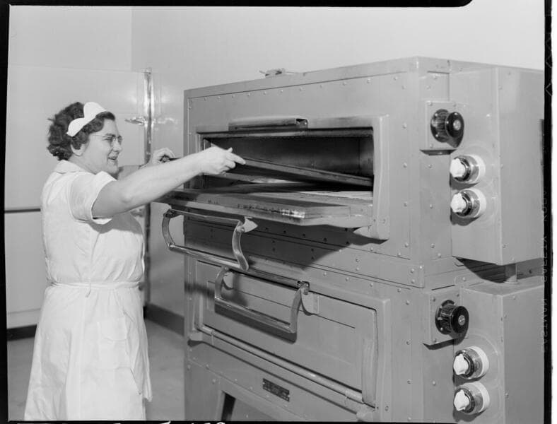 General view service tables, with manager & assistant, Mark Keppel High Shool cafeteria, Alhambra