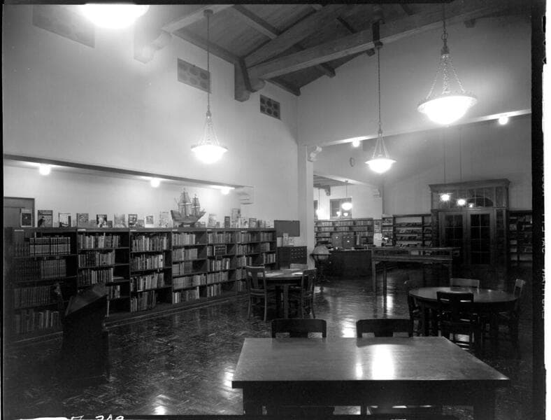 "Before" lighting - Arcadia Library - medium shot book stacks.