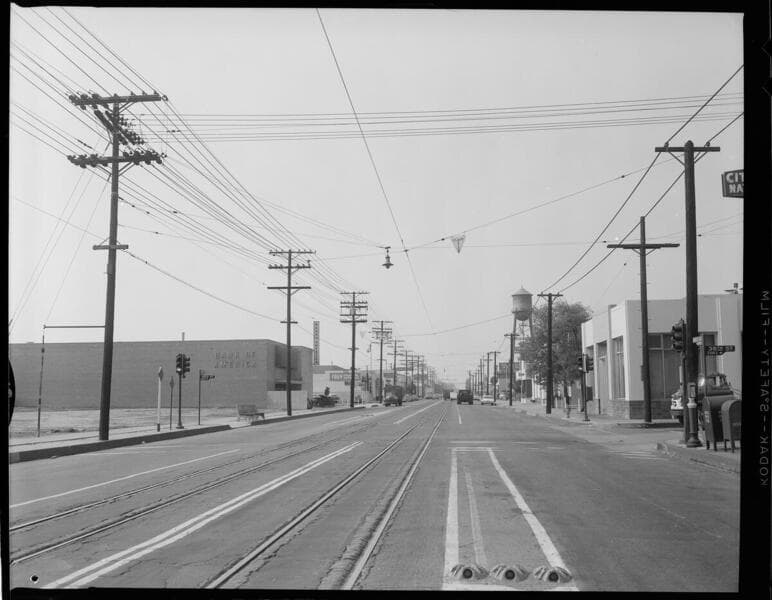 Street scenes on Santa Fe Ave. at 38th Street with electric rail and street lighting