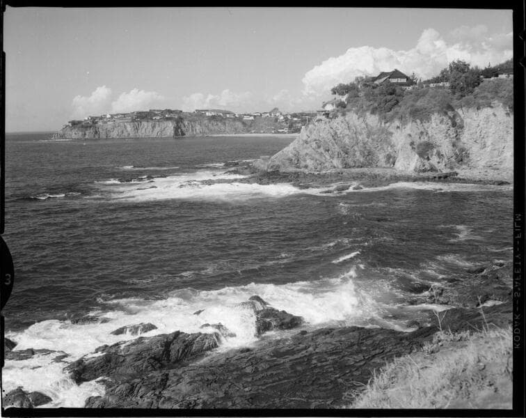 [Framework of homes under construction on cliffs overlooking the ocean (Palos Verdes? rel)]