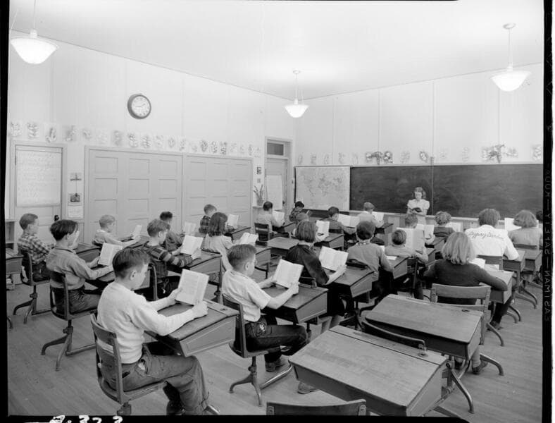 Electric lighting in several different locations [drafting room, elementary school classroom, busness office, board room, Hunt's China Shop, and a bank. - 7 variants]