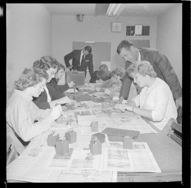 Men setting table with Reddy Kilowatts and "8 balls" on the table cloth