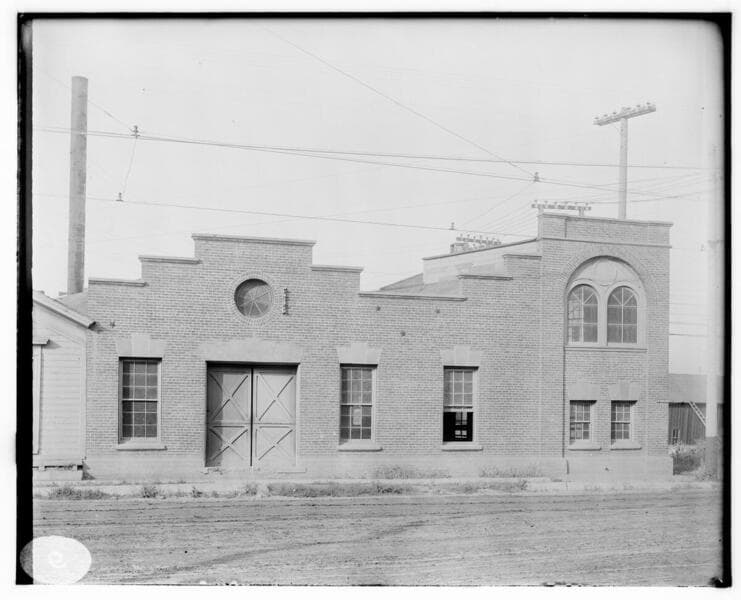 A street view of Los Angeles #1 Steam Plant, showing transmission lines in front of the building.