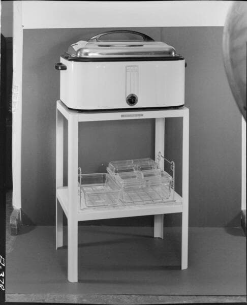 A3.1 - Appliances miscellaneous - Westinghouse Roaster School - l to r: Joe Schull, Mr. Rice, Mr. Hardy at table.