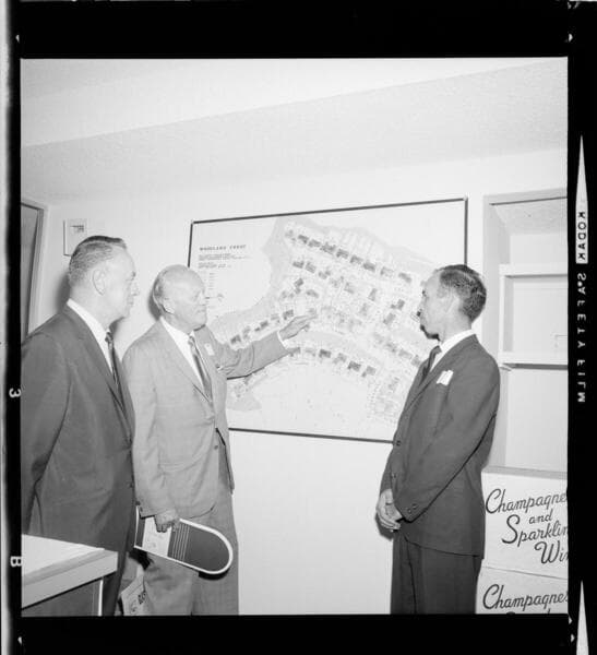 [People reviewing sale of parcels on a plot map for an upscale housing development.] [with 6 variants]