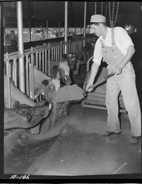 Dairy Booklet photos - J. Hilarides. Dairy - Bellflower - loading manure spreader.