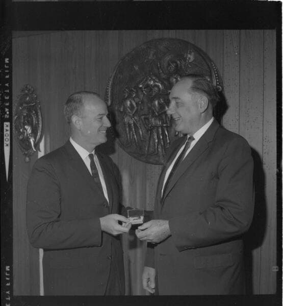 [Executives gathered at the Rosemead General Office with an award certificate presented to SCE - Gould, Horton, and H. P. Allen are present.] [with 15 variants]