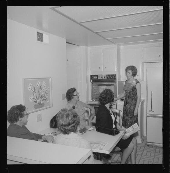 [Home economist giving a demonstration on electric appliances to group of ladies in a teaching kitchen] [with 18 variants]