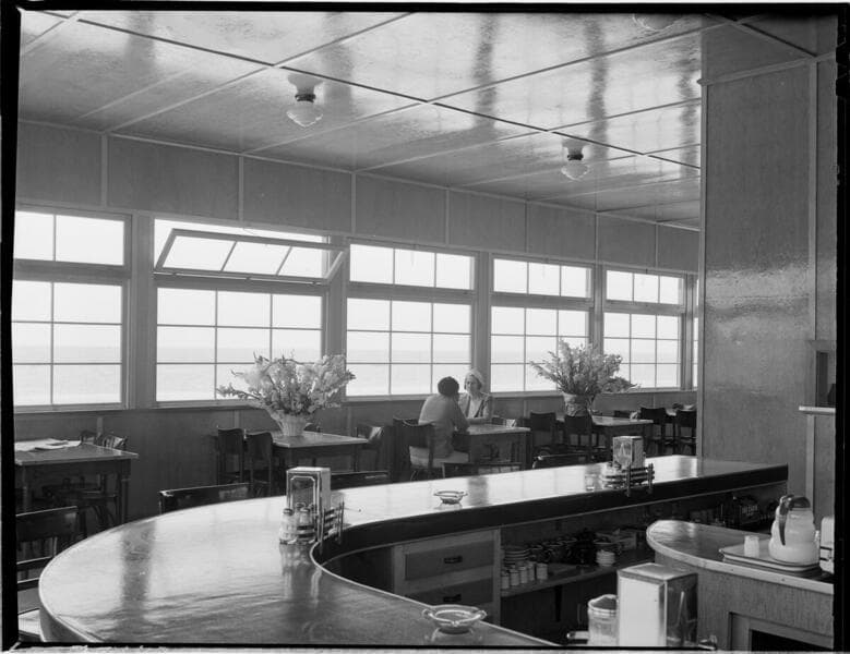 Image of automobiles at Point Mugu Lagoon, on Oxnard-Santa Monica Boulevard on the Roosevelt Highway (later Pacific Coast Highway), in Malibu, California.