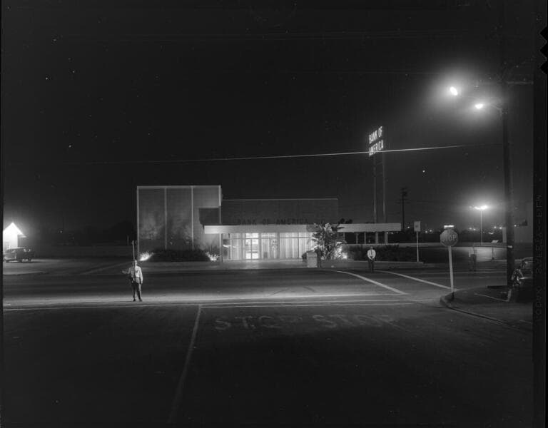 [Men by streetlight on street corner with sign "Chapman Woods Street Lighting Demonstration Unit - SCE -] [with 6 variants]