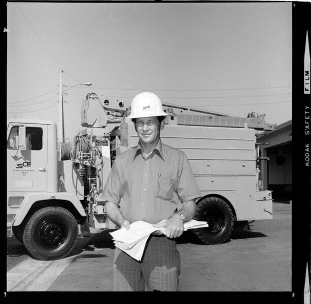 [Lineman school - pole top fuse insulator training props - portrait of unknown subject] [with 9 variants]