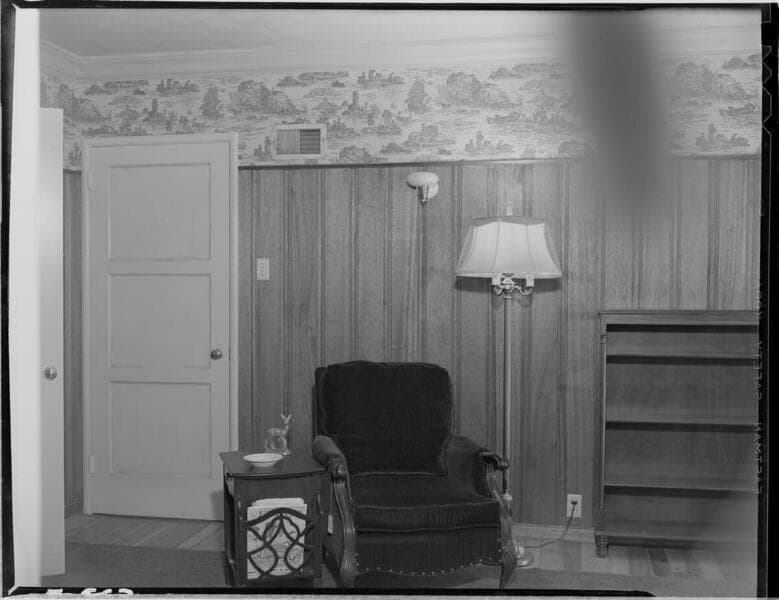 Edison demonstrations at the Model Home Show. Four bathing beauties, a mariachi band, and guests around a model back yard swimming pool. - Model Home Show