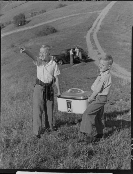 Electrical Times Cover - Picnic scene, Kenyons boys, Bob Campbell. [boys are carrying a Westinghouse cooker up a grassy slope]