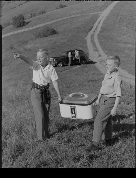 Electrical Times Cover - Picnic scene, Kenyons boys, Bob Campbell. [boys are carrying a Westinghouse cooker up a grassy slope]
