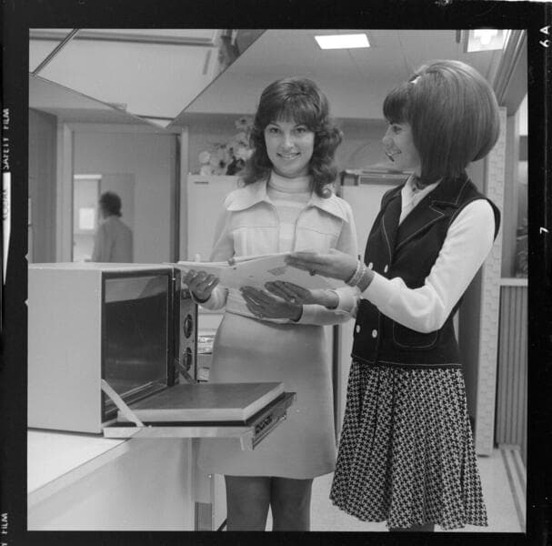 Woman demonstrating the use of a "Broiler Shelf" for an oven. Two separate images are on the copy negative.