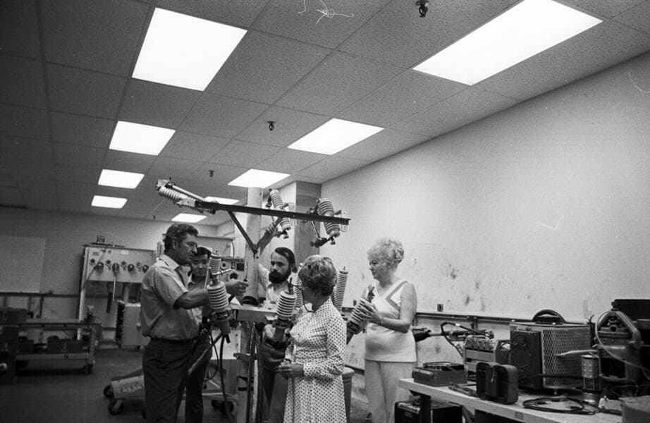 [Lineman on pole and apprentice on ground supplying equipment and tools to lineman - women working in office using data processing equipment and check writing machines.] [with 35 variants]
