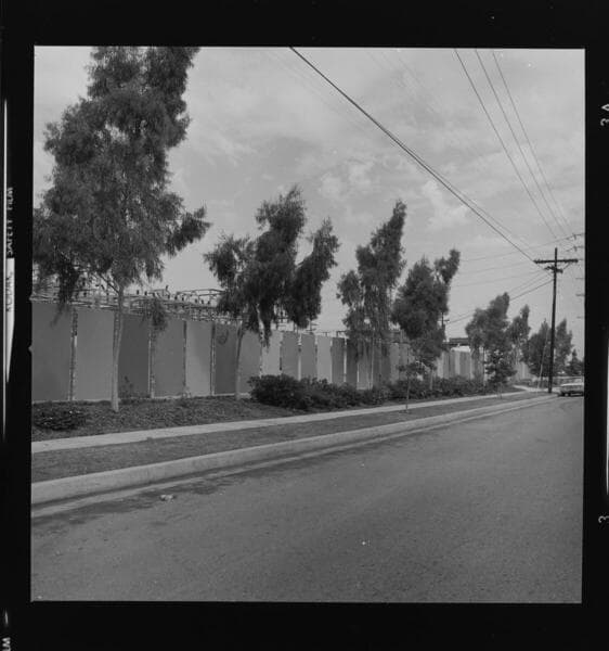 [Double-circuit transmission line corridor with "bird cage" insulators on single pole construction - Bluff Cove Substation] [with 3 variants]