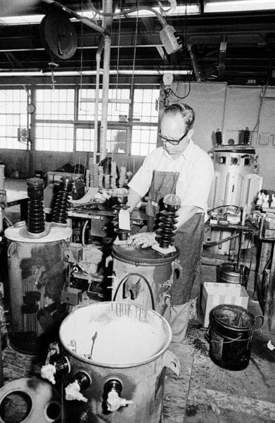 Electrical worker building or repairing distribution pole-transformers at a warehouse and loading equipment onto rail cars with a forklift