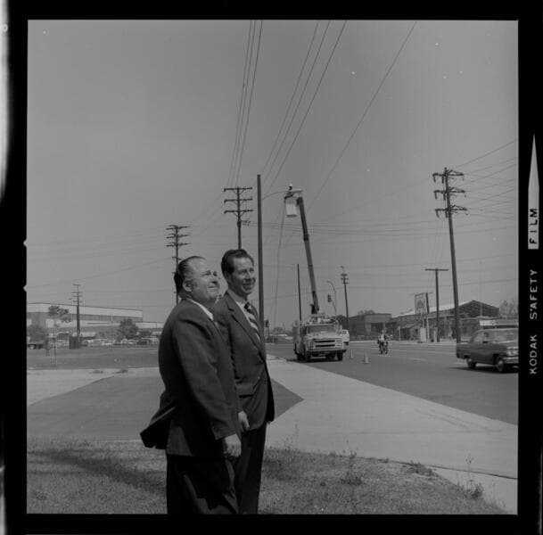 [Men in suits posing with electrical worker servicing street lights] - [with 5 variants]