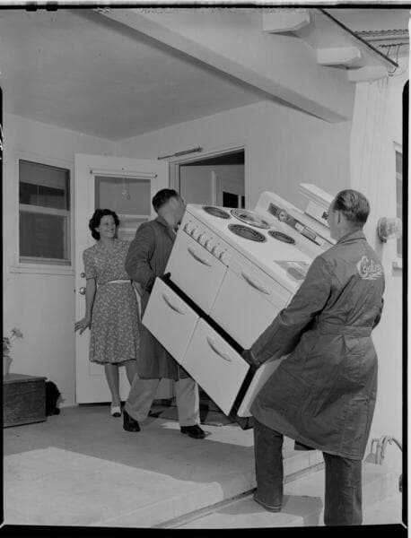 Electrical Times Cover - Picnic scene, Kenyons boys, Bob Campbell. [boys are carrying a Westinghouse cooker up a grassy slope]