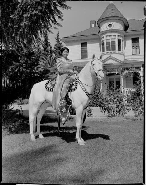 Sunset ad. - Carmen Camarillo on horse - long shot. [the horse is a beautiful palamino, and the saddle and stirrups are very ornate. She is posed in front a 3-story Victorian mansion].