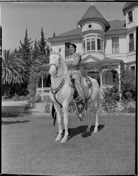 Sunset ad. - Carmen Camarillo on horse - long shot. [the horse is a palamino and the saddle and stirrups are very ornate. She is posed in front a 3-story Victorian mansion].